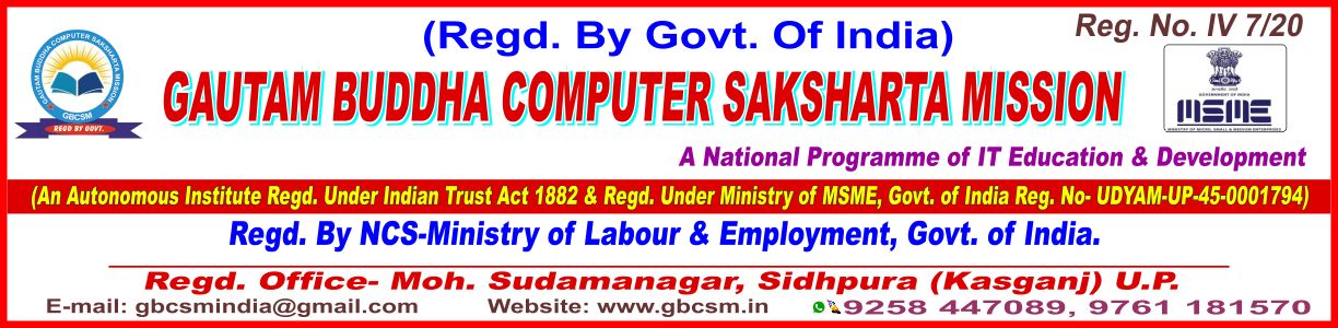 Gautam Buddha Computer Saksharta Mission is registered under the Trust Act 1882. We are providing Computer Training Centers and Vocational Courses all over India with the help of our branch network in small towns and villages. Gautam Buddha Computer Saksharta Mission is also registered with the Ministry of Micro Small medium Enterprises, Government of India Registerdby NCS Ministry of Labour and Employment government of india. And is also a certified institute by NITI Aayog. We believe in practical and job oriented courses and provide certification to the students along with their school and college studies to get a job or start their own business.